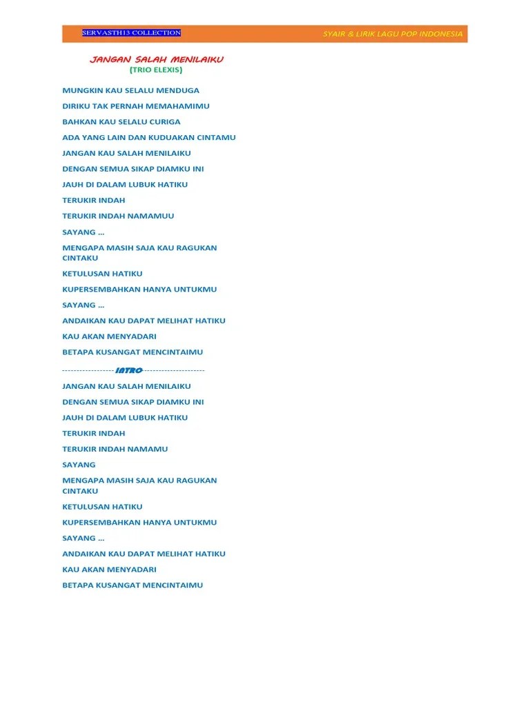 Andaikan kau bisa melihat hatiku. Sayang, andaikan kau bisa melihat hatiku kau akan menyadari betapa ku sangat mencintaimu jangan salah menilaiku dengan semua sikap diamku ini Andaikan kau bisa melihat hatiku. Sayang andaikan kau bisa melihat hatiku. Kau akan menyadari betapa ku sangat mencintaiku. Sayang andaikan kau dapat melihat hatiku. Ketulusan hatiku kupersembahkan hanya untuk mu sayang andaikan kau dapat melihat hatiku kau akan menyadari betapa ku sangat mencintaimu . Sayang mengapa masih saja kau ragukan diriku? Kau akan menyadari betapa ku sangat mencintaiku. Betapa ku sangat mencintaimu jangan kau salah menilaiku dengan semua sikap diamku ini jauh didalam lubuk hatiku terukir indah terukir indah namamu sayang . Lagi viral lirik lagu jangan salah menilai yang dipopulerkan oleh tagor. Kau akan menyadari betapa ku sangat mencintaiku. Lirik lagu jangan salah menilaiku docx , sayang andaikan kau dapat melihat hatiku.